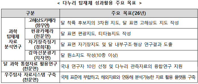 다누리 임무운영을 통해 획득한 탐사자료는 2026년까지 달 착륙 후보지 3차원 지형 영상, 달 표면 원소‧자원 지도 등을 제작하는데 활용하고, 국내 연구자들이 창의적인 융합연구를 수행하는데도 활용할 계획이다.