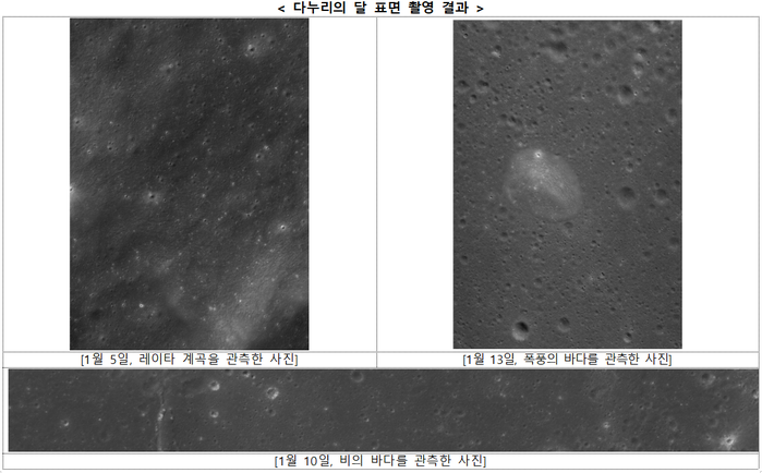 다누리는 또 올해 1월 2일부터 2월 3일까지 약 1개월 간의 시운전운영기간 중, 달 임무궤도(달 상공 약 100km) 상에서 달 표면을 고해상도 카메라로 촬영하는데 성공하기도 했다.