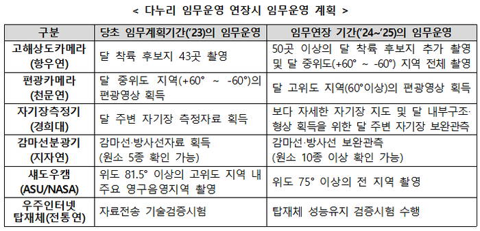 ▲ 다누리 임무기간 연장에 따른 6개 탑재체 추가 임무운영 계획. [과학기술정보통신부 제공] |