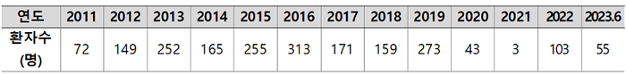 코로나19 발생 직전 해인 2019년엔 273명이 발생했으나, 코로나19 발생 이후인 2020년과 2021년엔 각각 43명과 3명으로 크게 줄었다가 지난해 103명으로 다시 증가했다.