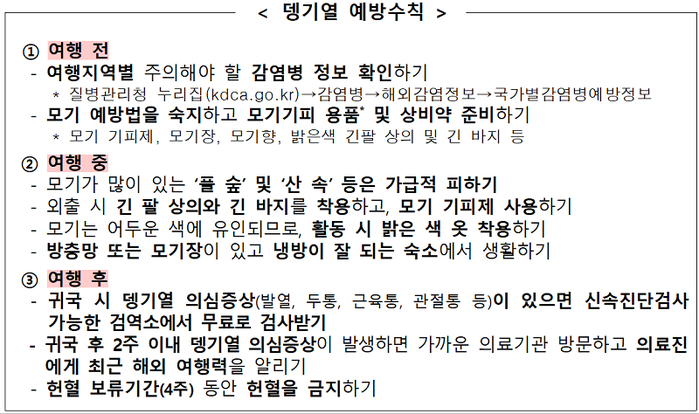 질병관리청은 한국 국민이 여행지로 선호하는 동남아시아에서 뎅기열 발생이 유행하고 있다며 이같이 강조했다.