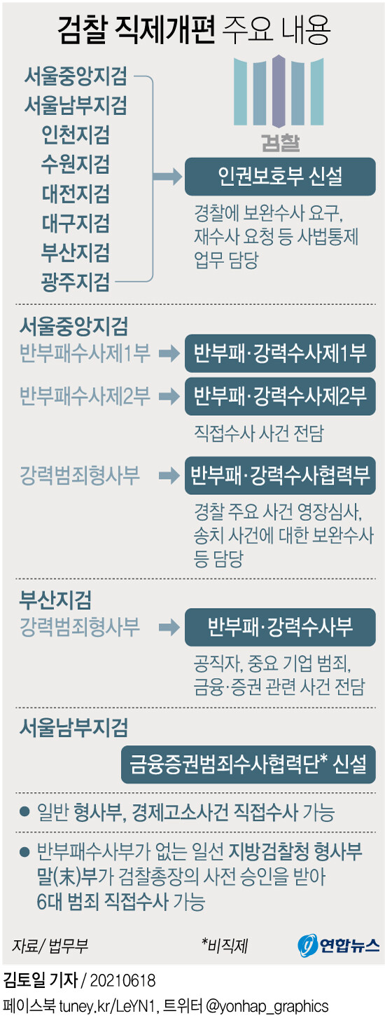 서울중앙지검 등 지방검찰청 8곳에 인권보호부가 신설되고, 일부 지방검찰청의 반부패수사부-강력범죄형사부, 공공수사부-외사범죄형사부가 각각 통폐합된다. 서울중앙지검에 반부패·강력수사협력부, 서울남부지검에 금융·증권범죄수사협력단, 부산지검에 반부패·강력범죄수사부가 설치된다.