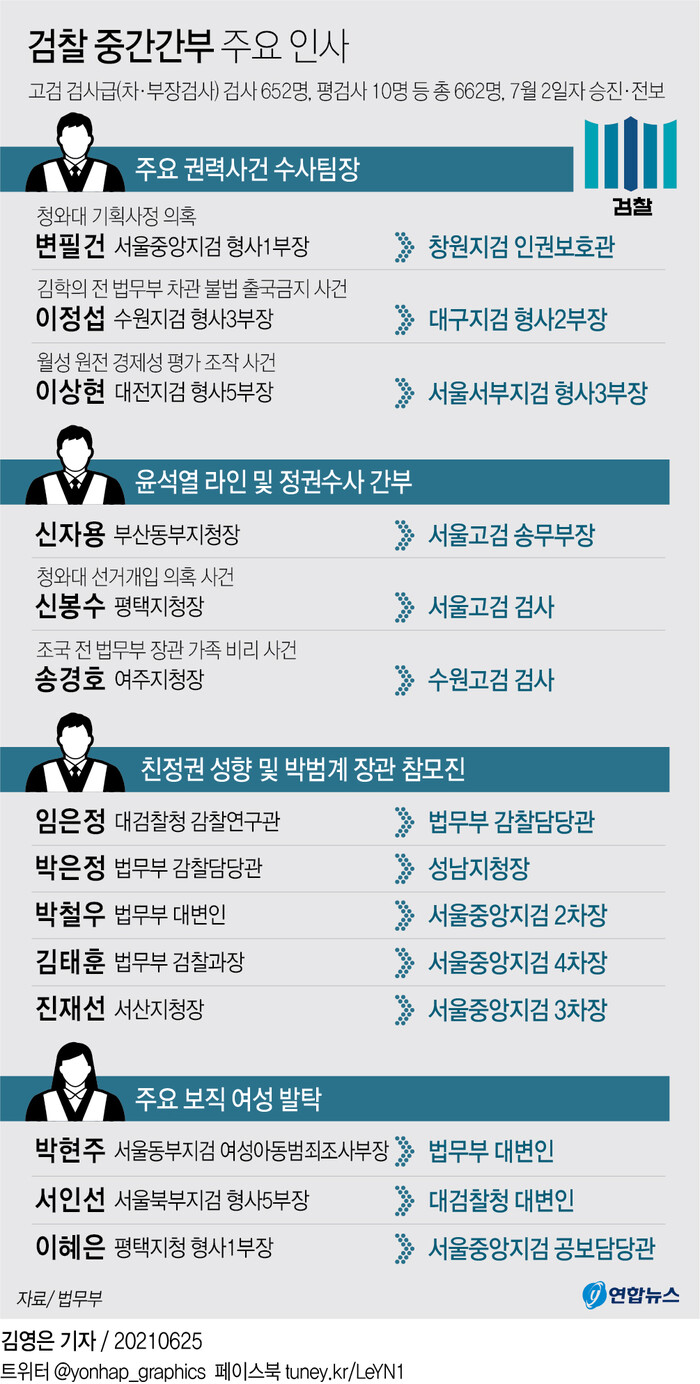 ▲ 검찰 중간간부 주요 인사 내용. 법무부는 25일 고검 검사급 검사 652명, 일반 검사 10명 등 검사 662명에 대한 신규 보임·전보 인사를 단행했다. [그래픽=연합뉴스] |