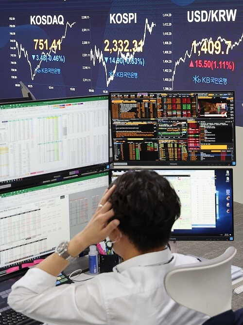 ▲ '매파' 연준 여파로 22일 코스피 지수는 전 거래일보다 14.90p(0.63%) 내린 2332.31로, 스닥 지수는 3.48p(0.46%) 내린 751.41으로 각각 거래를 마쳤다. 외환시장 원/달러 환율은 전장보다 15.5원 오른 1409.7원으로 마감했다. 사진은 이날 오후 서울 여의도 KB국민은행 딜링룸에서 딜러가 업무를 보고 있는 모습. [서울=연합뉴스] |