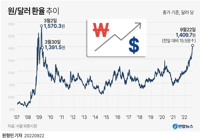 환율이 1410원대를 기록한 것은 금융위기 당시인 2009년 3월 31일(고가 기준 1422.0원) 이후 13년 6개월여 만이다. 종가 기준으로는 2009년 3월 20일(1412.5원) 이후 최고치다.