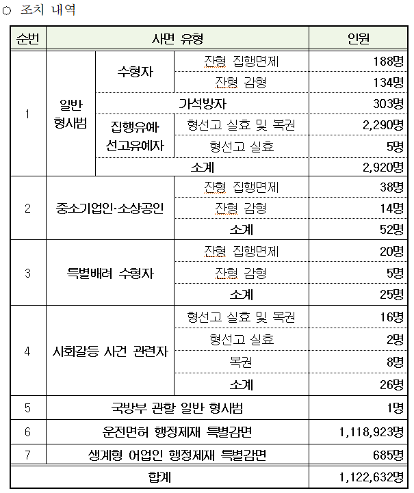 이번 사면 내역을 보면, ▲일반 형사범 특별사면·감형·복권 2920명 ▲중소기업인·소상공인 특별사면·감형 52명 ▲특별배려 수형자 특별사면·감형 25명 ▲사회적 갈등 사건 관련자 특별사면·복권 26명 ▲국방부 관할 대상자 특별사면·복권 1명 ▲운전면허 행정제재 특별감면 111만8923명 ▲ 생계형 어업인 행정제재 특별감면 685명이다.