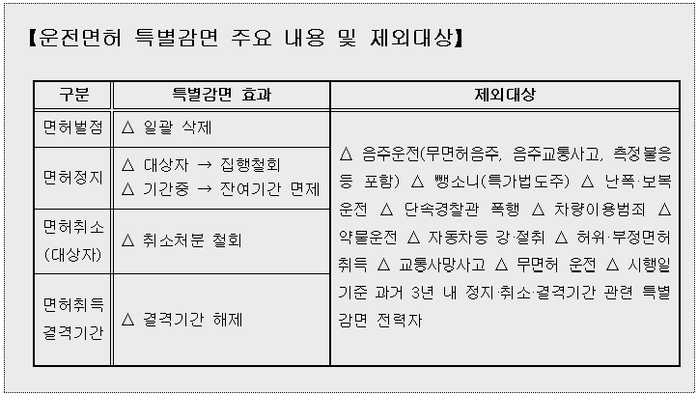 ▲ 운전면허 특별감면 주요 내용 및 제외대상. [출처= 법무부] |