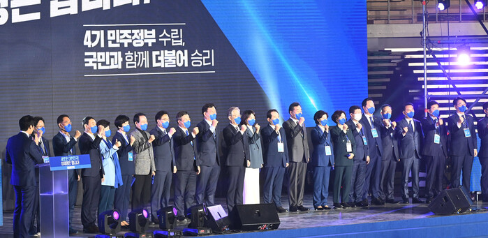 ▲ 2일 더불어민주당 대선 선대위 출범식에서 선대위원장들과 함께 승리를 위한 구호를 외치고 있다. 매머드급으로 꾸려진 이날 선거대책위원회 출범식은 '원팀 선대위'를 거듭 다짐하는 무대였다. 전날부터 적용된 정부의 '단계적 일상 회복' 방침(최대 499명 참석 허용)에 따라 총 376명이 참석하는 대규모 행사로 치러졌다. [국회사진기자단=연합뉴스] |