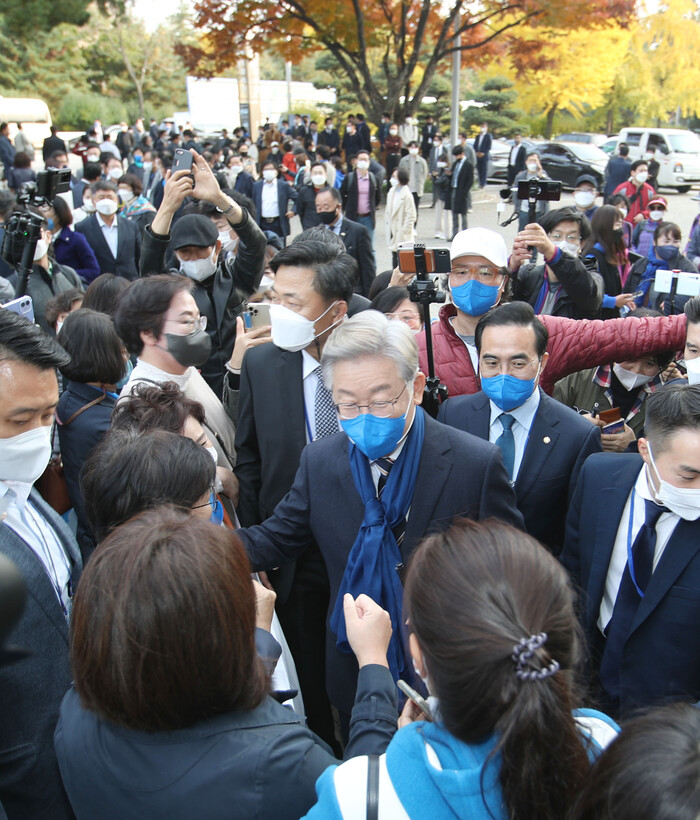 이 후보는 이날 연설에서 ’이재명 정부‘를 7번이나 언급, 문재인 정부를 계승하면서도 문재인 정부와 차별화하겠다는 노력도 엿보였다.