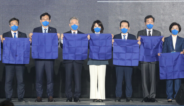 ▲ 2일 더불어민주당 제20대 대통령선거 선거대책위원회 출범식에서 이재명 대선 후보와 부인 김혜경 씨, 송영길 당대표, 이낙연 전 대표 등이 선대위 출범 각오를 담은 단체 퍼포먼스를 하고 있다. [국회사진기자단=연합뉴스] |