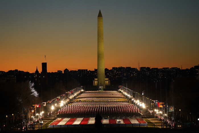 과거 같으면 신임 대통령은 발 디딜 틈 없이 가득 찬 인파가 지켜보는 가운데 취임 연설을 하지만 이번에는 코로나19와 폭력사태 재발 우려로 약 19만1500개의 깃발이 축하인파를 대신한다.