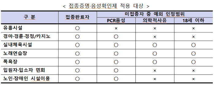 ▲ '접종증명‧음성확인제'(방역패스) 적용 대상. [중앙재난안전대책본부 제공] |
