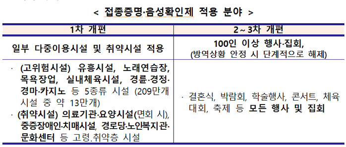 ▲ '접종증명‧음성확인제'(방역패스) 적용 분야. [중앙재난안전대책본부 제공] |
