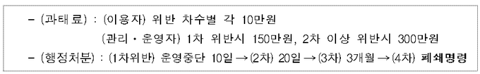 과태료의 경우, 이용자에게는 위반 차수별로 각 10만원씩, 관리·운영자에게는 1차 위반 시 150만원, 2차 이상 위반 시 300만원을 각각 물린다.