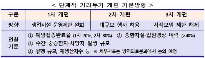 ▲ 단계적 일상회복 위한 거리두기 개편 기본방향. [중앙재난안전대책본부 제공] |