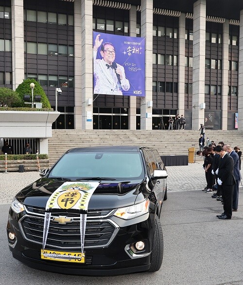 | ▲ 10일 오전 서울 영등포구 KBS 본관 앞에서 열린 '국민 MC' 방송인 고(故) 송해 추모 노제를 마친 뒤 영구차가 떠나고 있다. [서울=연합뉴스] |