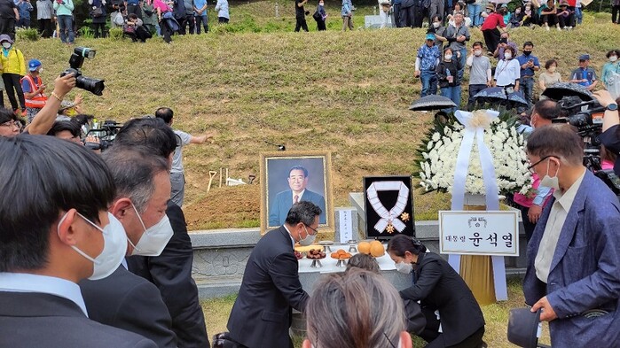 안장식은 지난 2018년 먼저 세상을 떠난 부인 석옥이 여사의 묘 옆에 마련된 가묘에 유해를 묻는 하관식을 시작으로 봉토 작업, 제례 등의 순으로 치러졌다.