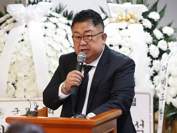 | ▲ 10일 서울 종로구 서울대학교병원 장례식장에서 열린 '국민 MC' 방송인 고(故) 송해의 영결식에서 개그맨 이용식이 추도사를 하고 있다. [공동취재=연합뉴스] |