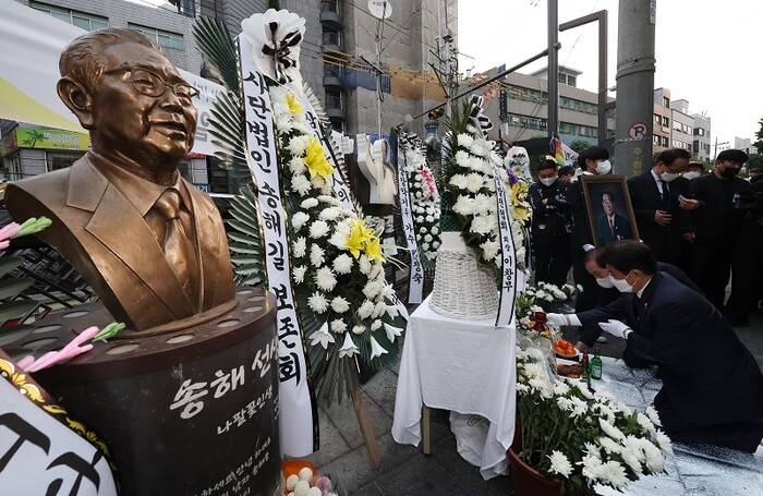 | ▲ '국민 MC' 방송인 고(故) 송해의 발인식이 엄수된 10일 오전 서울 종로구 송해길 동상 앞에서 '국민 MC' 방송인 고(故) 송해 추모 노제가 진행되고 있다. [공동취재=연합뉴스] |