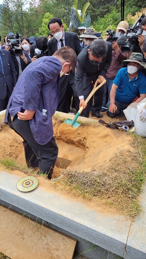 | ▲ 10일 오후 대구 달성군에서 열린 고(故) 송해 선생 안장식에서 엄영수 코미디언협회장이 하관 뒤 흙을 덮고 있다. [대구=연합뉴스] |