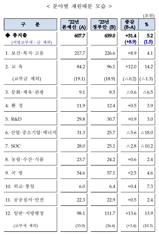 정부는 내년 예산을 올해 본예산(607조7천억원)보다 5.2% 늘어난 639조원으로 편성했다. 추가경정예산안까지 포함한 전년도 총지출(679조5천억원)보다 적다.