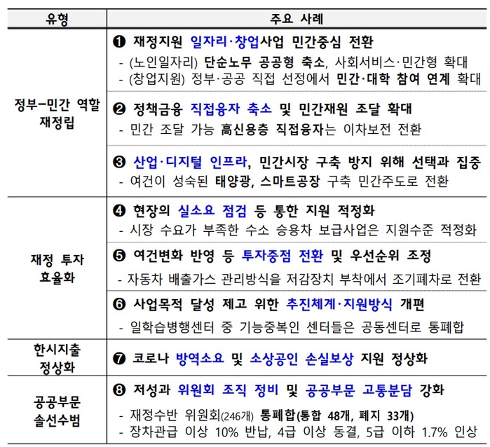 예를 들어, 민간역량 활용을 위해 정부가 직접 주도하던 일자리·창업 지원사업은 민간중심으로 전환하고, 민간시장을 구축할 우려가 있는 산업·디지털 인프라 지원 사업도 민간주도로 개편한다.