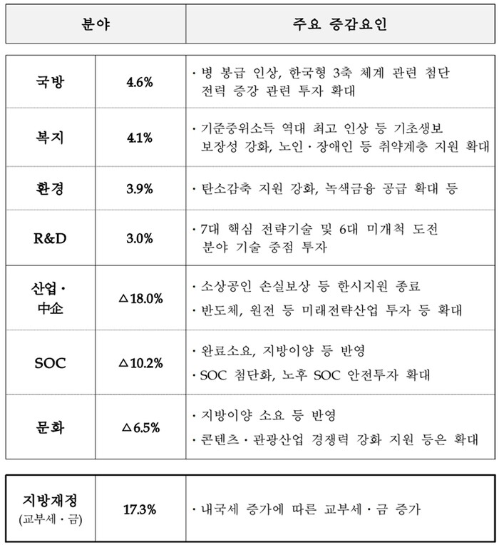 코로나 한시 지출 종료와 재정분권이 동시에 영향을 미치면서 중앙정부의 산업·중소기업·에너지 분야 지출은 18.0%, 사회간접자본(SOC)은 10.2%, 문화·체육·관광 분야는 6.5%씩 줄었다.