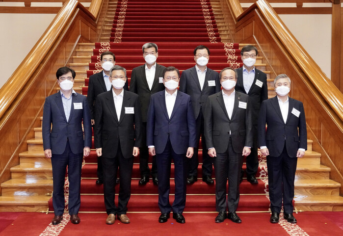 ▲ 문재인 대통령이 15일 오후 청와대에서 열린 확대경제장관회의를 마치고 참석자들과 기념촬영을 하고 있다. 앞줄 왼쪽부터 공영운 현대자동차 사장, 이정배 삼성전자 사장, 문 대통령, 이석희 SK하이닉스 사장, 최웅선 인팩 대표이사. 뒷줄 왼쪽부쿠 배재훈 HMM 사장, 가삼현 한국조선해양 대표이사, 정진택 삼성중공업 사장, 황호선 한국해양진흥공사 사장. [서울= 연합뉴스] |