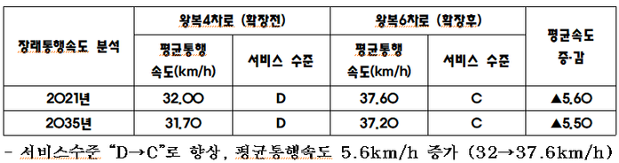 차량 평균통행속도가 시속 32㎞에서 37.6㎞로 약 5.6㎞ 빨라지고, 등급별(A~F)로 나타나는 서비스 수준은 D등급에서 C등급으로 향상될 것으로 기대된다.