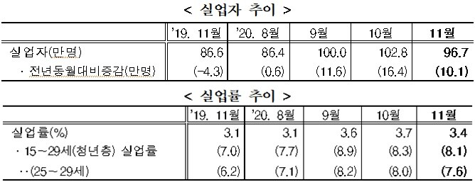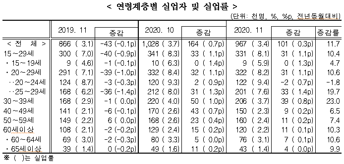 실업률은 20대(1.1%포인트), 30대(0.8%포인트), 40대(0.2%포인트), 50대(0.2%포인트) 등 모든 연령계층에서 상승해 3.4%로 전년 동월 대비 0.3%포인트 올랐다. 11월 기준으로 2004년 11월(3.5%) 이후 가장 높다.