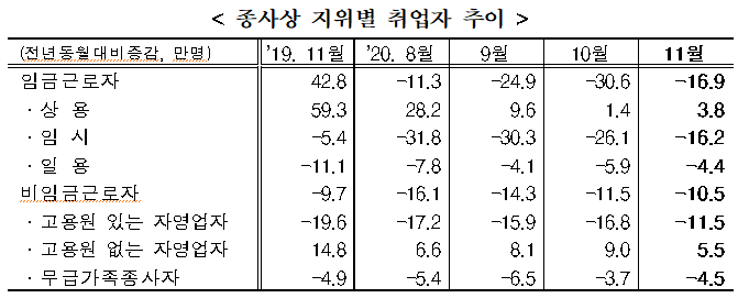 종사상 지위별로는 임시·일용직 근로자, 고용있는 자영업자의 감소세가 축소된 반면, 상용직 근로자 증가 폭은 소폭 확대됐다.