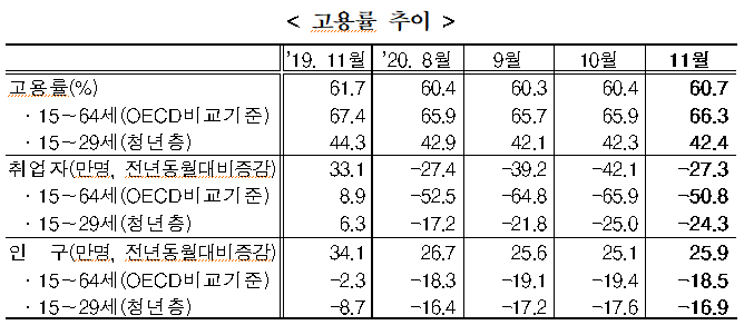 15세 이상 고용률은 60.7%로 전년 동월 대비 1.0%포인트 줄었다. 11월 기준으로 2013년 11월(60.7%) 이후 최저치다.