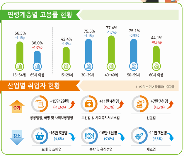 업종별로는 서비스업 감소폭이 축소된 반면, 제조업 감소폭이 소폭 확대되고, 건설업은 증가폭이 커졌다. 재정일자리 사업 등 영향으로 공공행정·보건복지업 증가폭도 확대됐다.