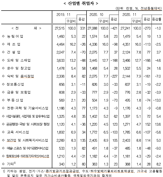 정동명 통계청 사회통계국장은 "10월 12일 거리두기 1단계 조정 영향으로 11월에는 대면서비스업 중심으로 취업자 감소 폭이 다소 축소됐다"며 "숙박·음식점업과 도·소매업 등은 감소 폭이 줄었고 공공행정, 보건·복지, 건설업 등은 증가 폭이 확대됐다"고 설명했다.