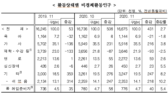 ▲ 활동상태별 비경제활동인구. [출처= 통계청] |