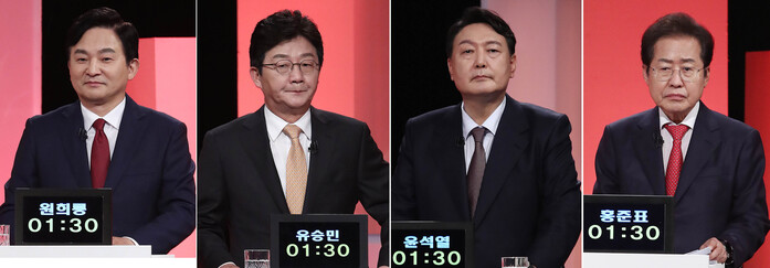 ▲ 국민의힘의 대선후보 경선 2차 컷오프 결과가 발표돼 4파전으로 재편됐다. 사진은 지난 5일 서울 여의도 KBS 스튜디오에서 열린 제6차 방송토론회에서 원희룡·유승민·윤석열·홍준표 후보(왼쪽부터 가나다순)가 토론을 준비하는 모습. [사진=연합뉴스] |