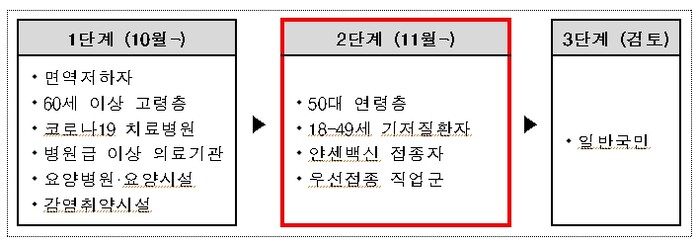 지난 10월부터 추가접종을 시행 중인 1단계 고위험군(면역저하자, 60세 이상 고령층, 코로나19 치료병원, 병원급 이상 의료기관, 요양병원·요양시설, 감염취약시설)에 이어, 2단계 고위험군(50대 연령층, 기저질환자, 얀센 백신 접종자, 우선접종 직업군)은 11월부터 추가접종을 실시하게 된다.