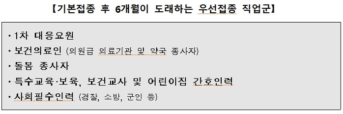 ▲ 기본접종 후 6개월이 도래하는 우선접종 직업군. [질병관리청 제공] |