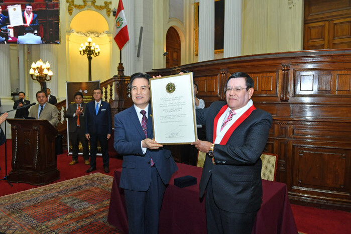 지난 25일(현지시각) 페루 리마 국회의사당에서 열린 시상식에서 알레한드로 소토 레예스 국회의장이 하나님의 교회 총회장 김주철 목사에게 훈장과 훈장증을 수여했다. 소토 레예스 국회의장은 연설을 통해 “하나님의 교회가 이타적 마음으로 페루 전역에서 헌신적인 봉사를 펼쳐왔다”며 이들의 활동이 국가적으로 높은 평가와 인정을 받고 있다고 강조했다. 또한 아르투로 알레그리아 가르시아 국회 제1부의장은 “페루 국민들을 위한 노고에 감사드린다”고 축하의 말을 전했다.