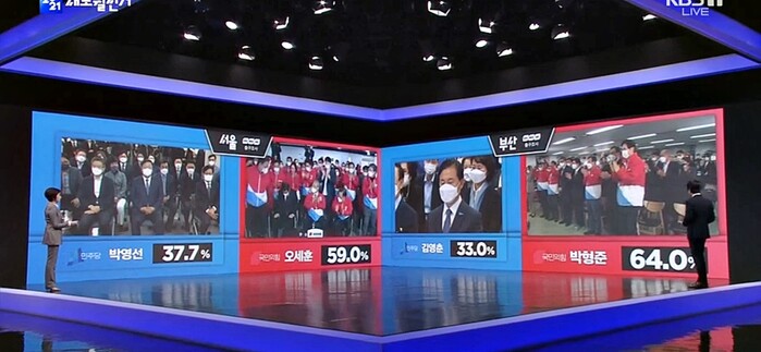 ▲ 7일 치러진 서울시장과 부산시장 보궐선거 방송 3사 출구조사 결과. [사진= KBS 1TV 개표방송 캡처] |