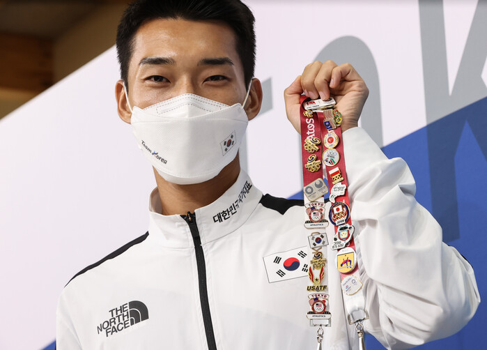 ▲ 2020 도쿄올림픽 남자높이뛰기에서 한국신기록 2m35를 넘으며 4위를 차지한 우상혁이 지난 2일 올림픽선수촌에서 가진 기자회견에서 올림픽 참석자들과 교환한 다양한 핀들을 보여주며 미소짓고 있다. [도쿄=연합뉴스] |