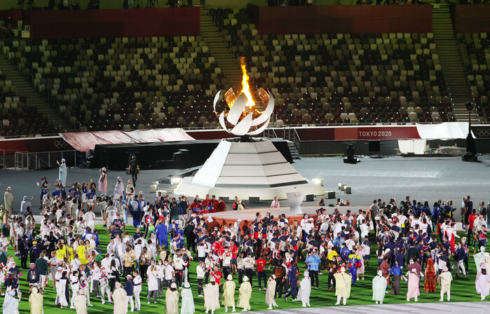 ▲ 8일 도쿄 신주쿠 국립경기장에서 열린 2020 도쿄올림픽 폐회식에서 선수들이 마지막 성화가 불타고 있는 가운데 즐거운 시간을 보내고 있다. [도쿄=연합뉴스] |