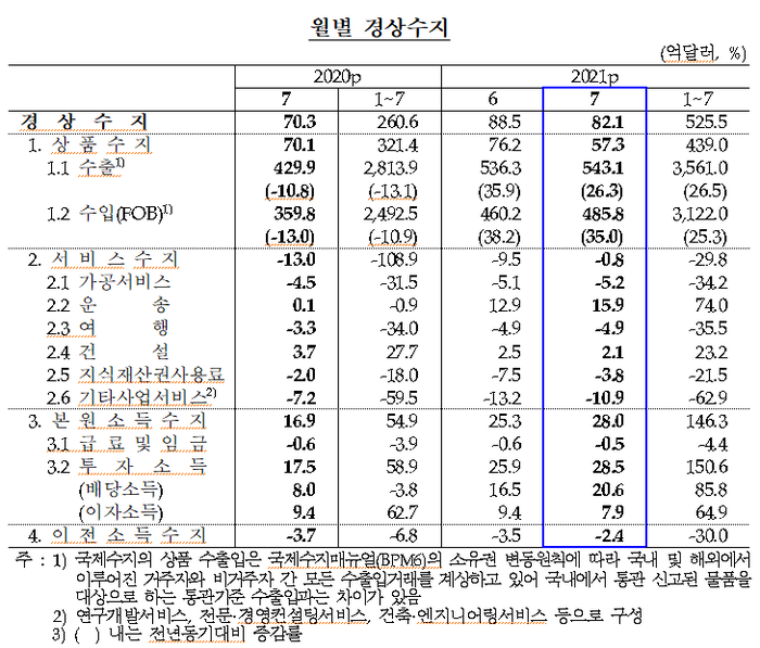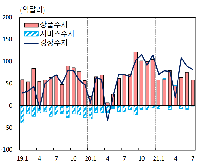한국은행이 7일 발표한 2021년 7월 국제수지 잠정치에 따르면, 경상수지 흑자는 82억1천만 달러(약 9조5000억원)로 집계됐다.