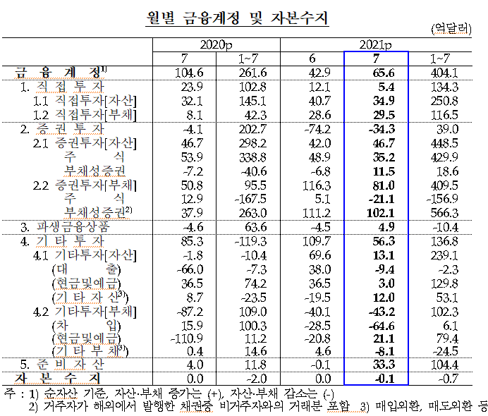 자산에서 부채를 제외한 금융계정 순자산은 7월 중 65억6천만 달러나 증가했다.