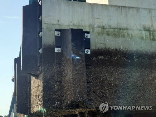 ▲ 31일 새벽 충남 서해상에서 9.77t급 낚싯배가 들이받은 원산안면대교 교각 모습. [사진= 보령해경 제공/연합뉴스] |