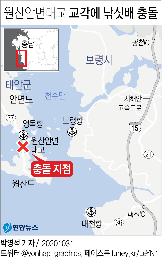 사고는 31일 오전 5시 40분께 충남 태안군 안면도와 보령시 원산도를 잇는 원산안면대교 아래에서 일어났다. 이곳을 지나던 9.77t급 어선 '푸른바다3호'가 1번 교각(영목항 기준)과 충돌한 것이다.