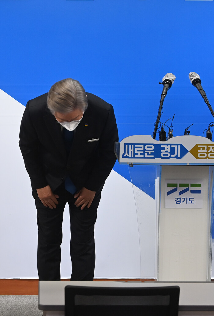 이 후보는 25일 오전 11시 경기도청 브리핑룸에서 퇴임 기자회견을 가졌다. 2018년 6·13 지방선거에서 당선돼 민선 7기로 3년 3개월여 동안 경기도정을 맡아왔다.