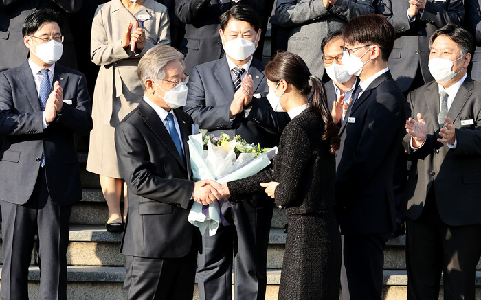 ▲ 더불어민주당 대선 후보인 이재명 경기도지사가 25일 오후 경기도 수원시 경기도청을 떠나며 꽃다발을 받고 있다. [수원=연합뉴스] |