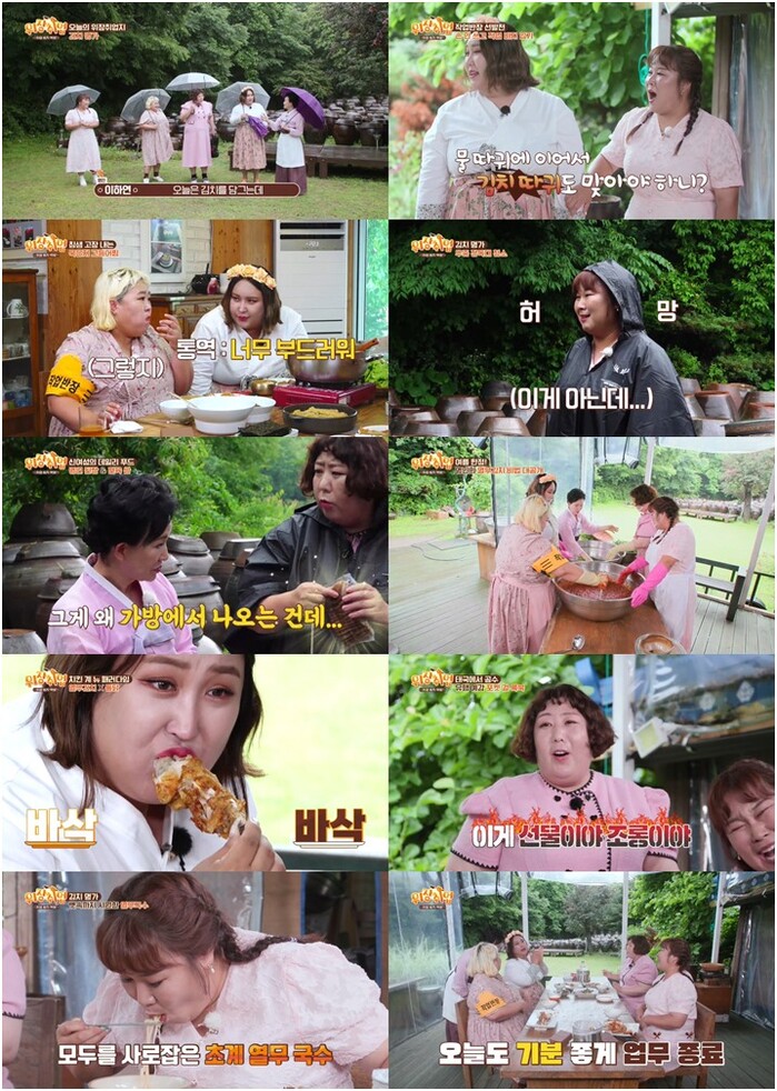 이후 4인방은 한식 명인이 대접해준 묵은지 지짐과 묵은지 고등어찜 등을 맛보며 무아지경 먹방에 빠졌다. 든든히 배를 채운 이들은 새참 값을 하기 위해 곧장 장독대 청소를 시작했다. 하지만 신기루는 장독대 사이사이가 협소하다는 것을 확인하고는 “못 들어갈 것 같다”며 엄살을 부렸다. 이에 ‘맏언니’ 김민경은 국대급 유연성을 뽐내며 재빠르게 청소해 모두를 감탄케 했다. 풍자는 “너무 날씬한 죄~”라며 김민경의 몸매를 부러워했다.