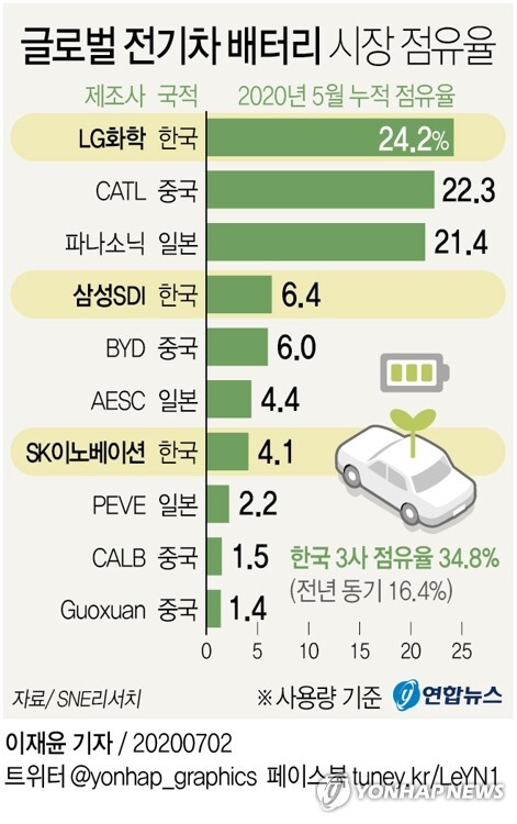 ▲ 지난 7월 2일 에너지 시장조사업체 SNE리서치에 따르면 올해 1∼5월 글로벌 전기차 배터리 시장 점유율(사용량 기준)에서 LG화학은 1위를 유지했고, 삼성SDI와 SK이노베이션도 나란히 순위가 상승했다. [그래픽= 연합뉴스] |